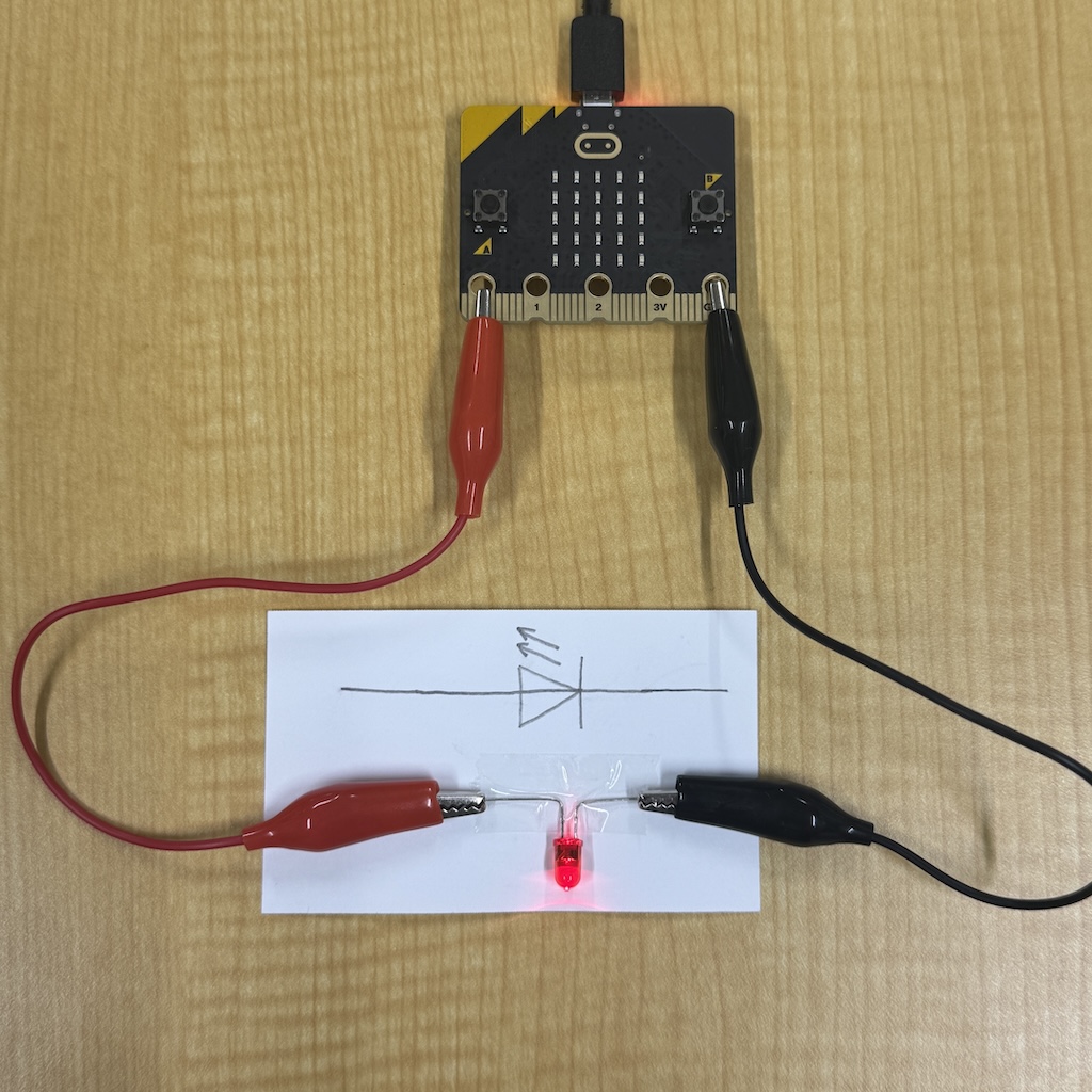 | P0端子(赤色)にLEDのアノードを,GND端子(黒色)にLEDのカソードをつないだ例 | ![]() |